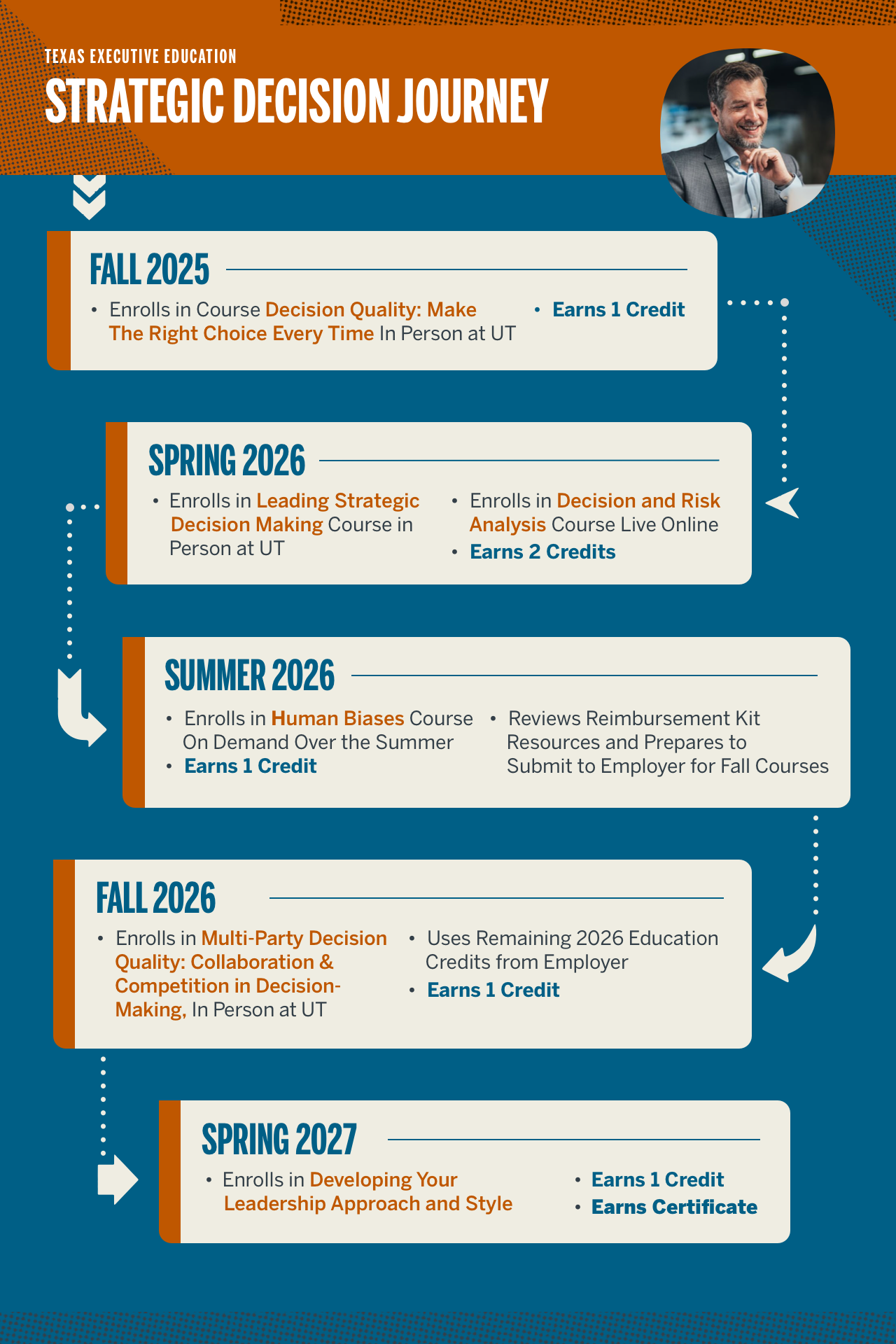 See an example Learner's Journey of a participant's path to earning a Texas Executive Education certificate.